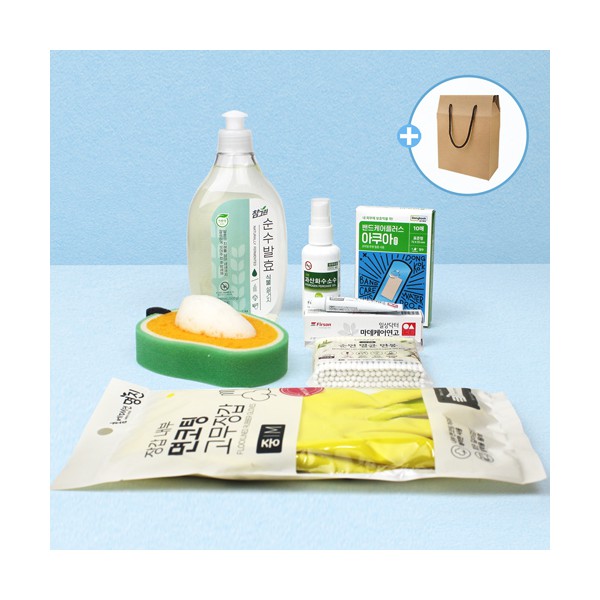 참그린 주방세제 용기 480ml + 과일수세미 + 면코팅 고무장갑 + 과산화수소수 소독제 스프레이형 + 동국제약 아쿠아 방수밴드 + 마데케어 연고 + 멸균면봉 100매 + 끈케이스