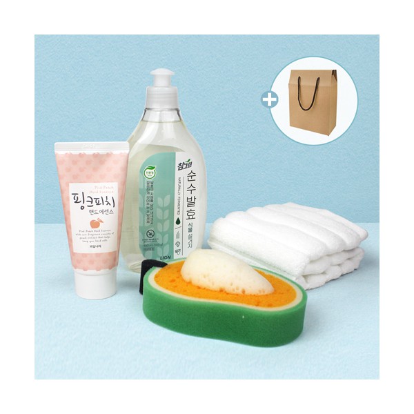 참그린 주방세제 480ml + 순면 골지 주방타올 + 과일 수세미 + 과일나라 핸드크림 + 끈케이스(이미지 변경 가능)