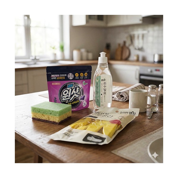 슈가버블 버블원샷 캡슐세제 + 참그린 주방세제 + 양면 떡수세미 + 면코팅고무장갑 + 끈케이스 + 케이스 이미지 선택가능