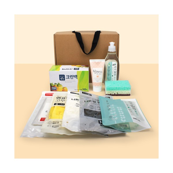 | 기타사항 | 위생백300매+주방세제 참그린 용기+리필+양면 떡수세미+과일나라 핸드크림+다용도앞치마+면코팅고무장갑+니트릴장갑 10매입 2개+끈케이스 스티커 제작 및 부착 별도문의 |