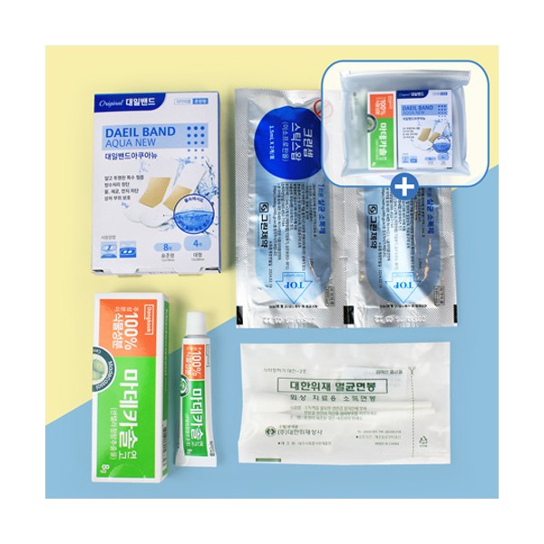 | 기타사항 | 정품 대일밴드 아쿠아 방수맨드 혼합12매 + 마데카솔 연고 8g + 스틱스왑 2개 + 상처 치료용 소독면봉 2매입 + 지퍼백 + 종이케이스 추가 별도문의 지퍼백 실크1도 인쇄 별도문의 지퍼백 스티커 제작 및 부착 별도문의 종이케이스 추가 별도문의 |