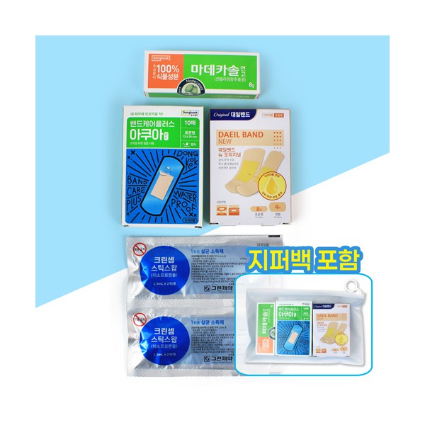 | 기타사항 | 마데카솔 연고8g+대일밴드 혼합 12매+동국제약 아쿠아 방수밴드 10매+스틱스왑 소독봉 2매입 2개+지퍼백+종이케이스 별도문의 지퍼백 실크1도 인쇄 별도문의 종이케이스 추가 별도문의 |