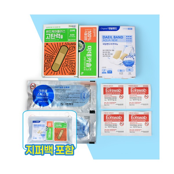 | 기타사항 | 대일밴드 아쿠아 방수밴드 혼합12매 + 동국제약 고탄력밴드 10매 + 마데카솔 연고 8g + 스틱스왑2매입 2개 + 알콜스왑 4개 + 지퍼백 + 종이케이스 별도문의 지퍼백 실크1도 인쇄 별도문의 종이케이스 추가 별도문의 |