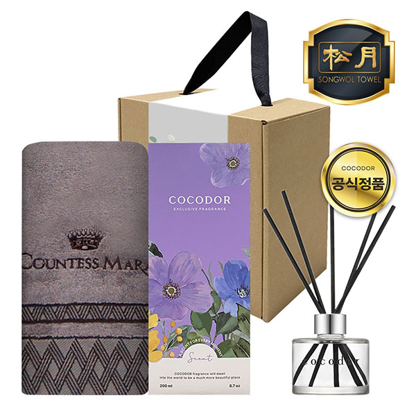 송월타월1장, 코코도르 디퓨저 1개, 일체형 손잡이박스, 속지, 감사스티커(랜덤)