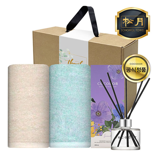 송월타월2장, 코코도르 디퓨저 1개, 일체형 손잡이박스, 속지, 감사스티커(랜덤)